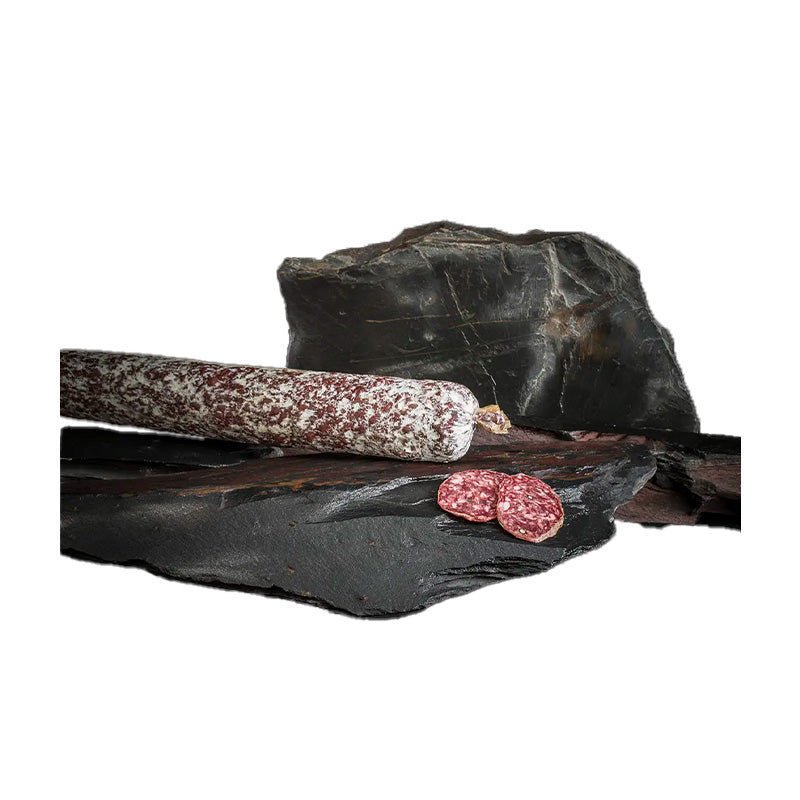 Der 100% iberische Bellota-Salchichón im Vela-Format von Maldonado wird aus 100% iberischem Schweinefleisch hergestellt, das mit Eicheln gefüttert wurde, und langsam gereift, um ein elegantes Aroma, eine feste und saftige Textur sowie einen tiefen Geschmack mit Pfeffernoten zu erzielen; jedes Stück wiegt ca. 0,300–0,450 kg und misst 25 cm Länge bei 3 cm Durchmesser. Es wird empfohlen, ihn vor dem Genuss auf Zimmertemperatur zu bringen und in dünne Scheiben zu schneiden, ideal zu Candeal-Brot oder Regañás sowie zu feinen Weinen oder jungen Rotweinen.